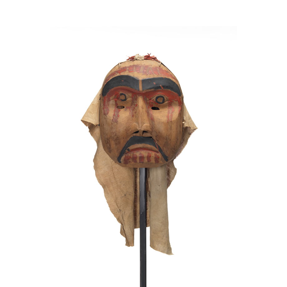 Mourning mask carved from red cedar. Most of the face is left unpainted, except for the eyebrows and a continuous moustache, which are painted black. Sight holes are crudely carved on the upper cheek (unlike the other three masks, where the sight holes are carved through at the iris). Red vertical streaks are painted on the forehead. A continuous red line follows the eyebrow line just above the eyes, from one side of the face to the other. On each side, three red vertical streaks flow across the eyes onto the cheeks. Five shorter red streaks are painted on the lower chin. The red lips are slightly frowning. A tuft of red cedar bark is attached on the top rim of the forehead. A piece of white cloth is nailed to cover the back.