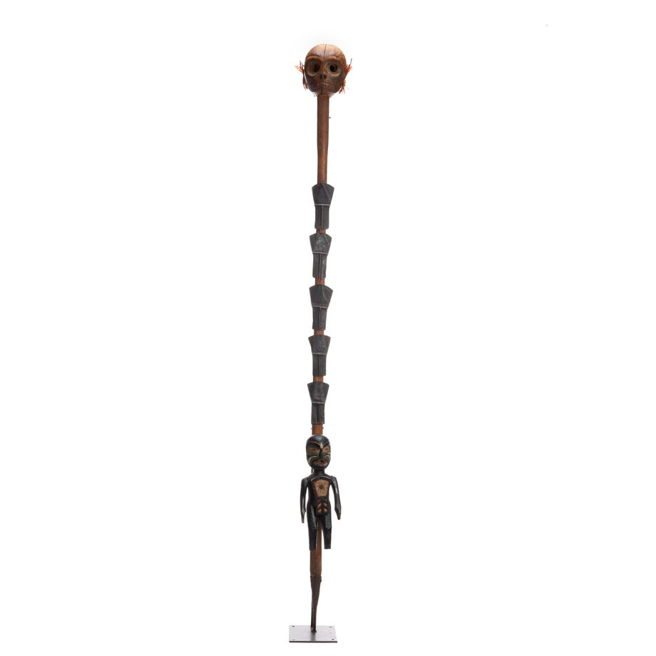 Speaker Staff: Carved, wooden staff with a single totemic figure on the bottom, five coppers and a carved wooden skull, which sits atop the staff. The bottom figure is a Dzunuk´wa with a wooden copper nailed to its chest and no feet. The bottoms of both legs have two nail holes each and are painted black, as though the feet, which were added to the piece, have now gone missing. The arms appear to be slightly articulated although this could be due to the nails loosening. The Dzunuk´wa is bolted to the staff through the back.