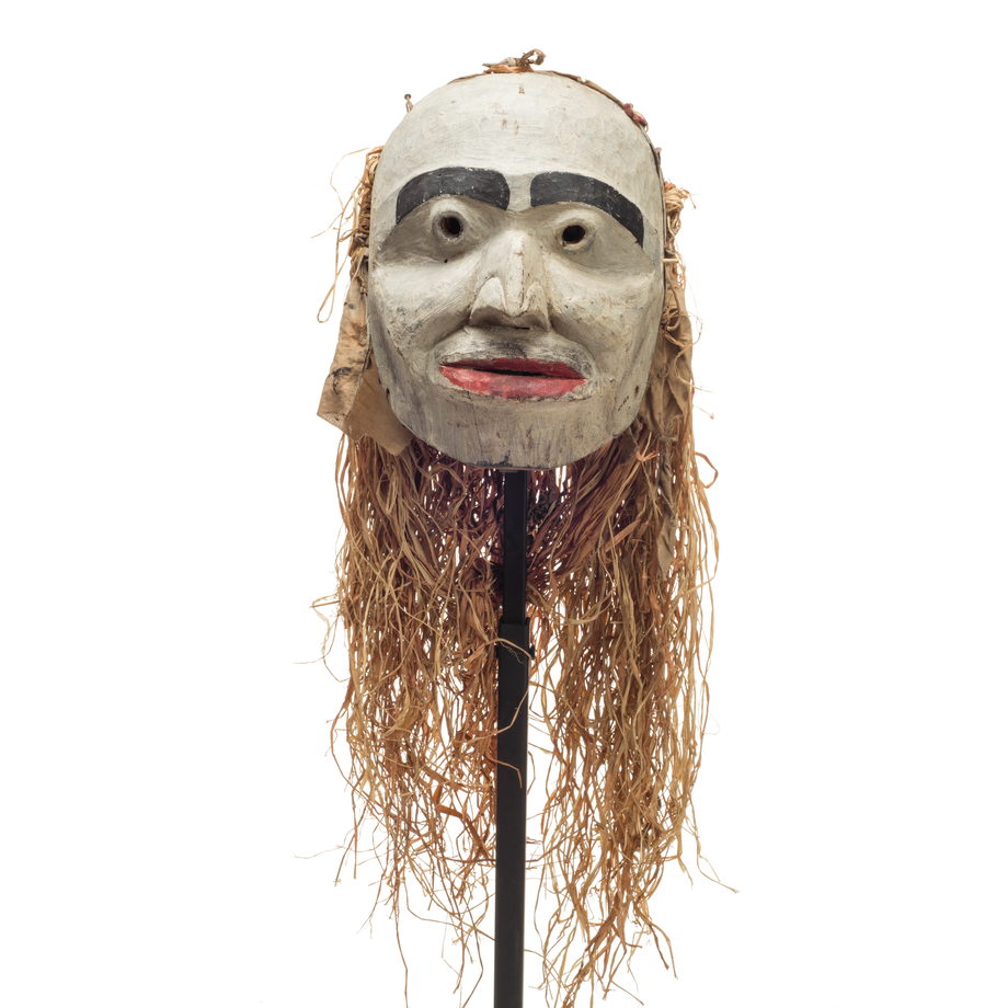 Masque Atłak´ima (la ronde des esprits sylvestres) non identifié mais répertorié comme appartenant à Harry Mountain des Mamalilikala. Ce masque humanoïde passé au blanc présente d’épais sourcils peints en noir et une bouche entrouverte aux lèvres peintes en rouge. Sur l’essentiel du masque, des motifs noirs sont visibles sous l’enduit blanc, ce qui laisse penser que le masque fut repeint et potentiellement modifié pour correspondre à un personnage de l’Atłak´ima. Une moustache est peinte au-dessus de la lèvre supérieure. Cette moustache, associée à la structure massive du visage sculpté, aux sourcils épais et au gros nez proéminent évoque un personnage masculin. Les yeux ouverts sont percés. L’absence de figuration des paupières suggère que cette créature serait d’une nature moins humaine que les autres masques d’esprits sylvestres. Des fragments de tissu rouge sont attachés sur le rebord du visage et il doit s’agir des restes d’un dispositif d’arrimage. Encore présente, une étoffe de coton souillée correspond peut-être au voile d’origine qui servait à cacher la tête du porteur. Du raphia est attaché au bord extérieur du masque, là où figure généralement de l’écorce de cèdre mi-écrue, mi-teinte en rouge pour indiquer l’appartenance de ce masque au cérémonial d’hiver, le T´seka.