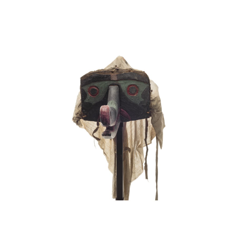 Coiffe de ‘Nala composée d’une plaque frontale attachée à un bandeau de tête. Cette pièce de bois rectangulaire est intaillée d’un visage plat doté de sourcils, d’yeux et de lèvres. Une pièce rapportée figure une longue trompe ou un long bec. La pointe du bec supérieur se recourbe vers le haut. La plaque est complètement peinte en noir avec des détails en rouge et en vert. Le « monosourcil » est blanc en son milieu. Du bois nu apparaît près des bords de la plaque. Un voile en étoffe souillée, cloué au sommet et sur les côtés, couvrait la tête du danseur. Les bandelettes de tissu qui pendent de la coiffe servaient probablement à son arrimage.